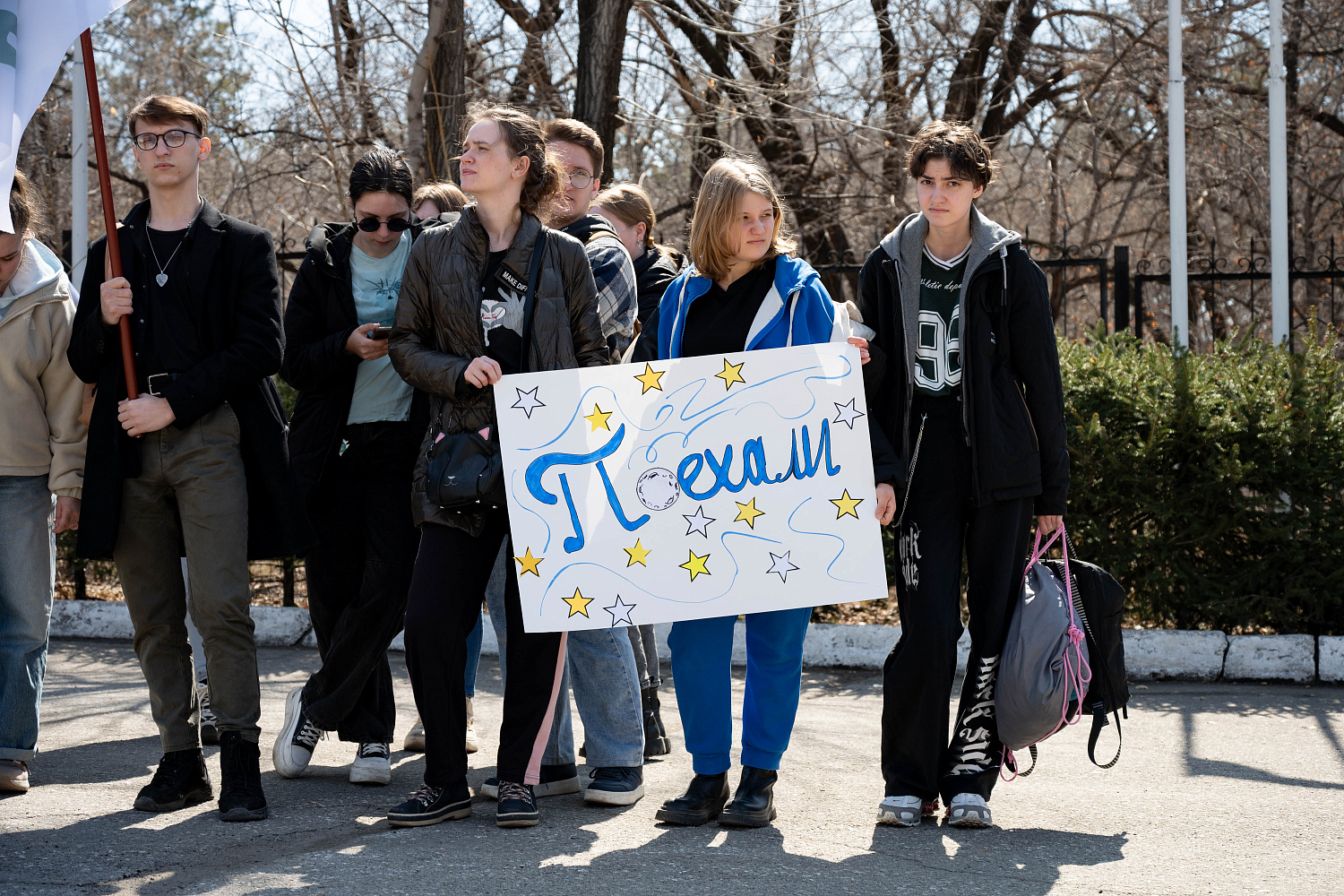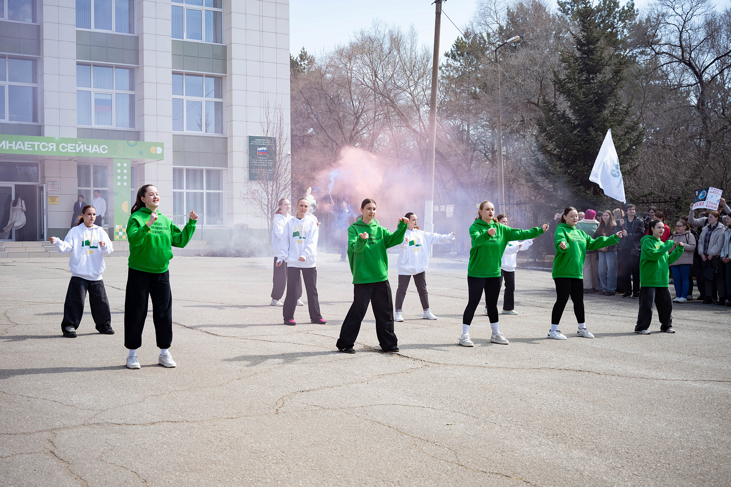 Программа началась с исторического момента: под звуковое сопровождение легендарного гагаринского «Поехали!» участники развернулись в торжественное построение у центрального крыльца, задав высокий патриотический тон всему мероприятию.